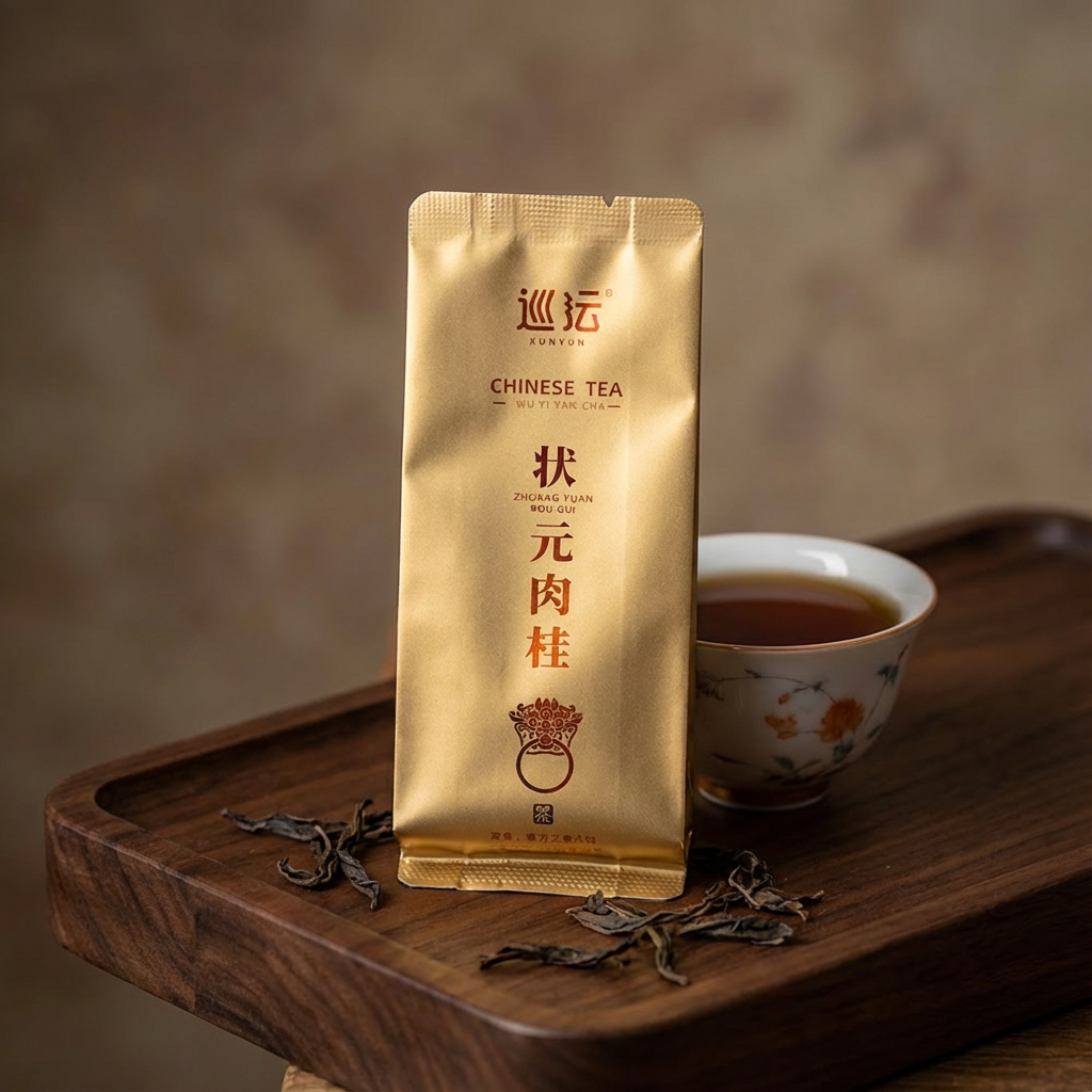 状元肉桂属于武夷岩茶中的肉桂茶类,是乌龙茶(半发酵茶)的一种。其原料选自武夷山核心产区“三坑两涧”的优质肉桂茶树,由经验丰富的制茶师手工精制而成,具有馥郁的桂皮香和醇厚鲜爽的岩韵特征。干茶与茶汤中带有鲜明的桂皮辛香,兼具花果香层次变化。汤色橙黄明亮,滋味醇厚鲜爽,回甘持久。具有武夷岩茶特有的“活、甘、清、香”岩骨花香。